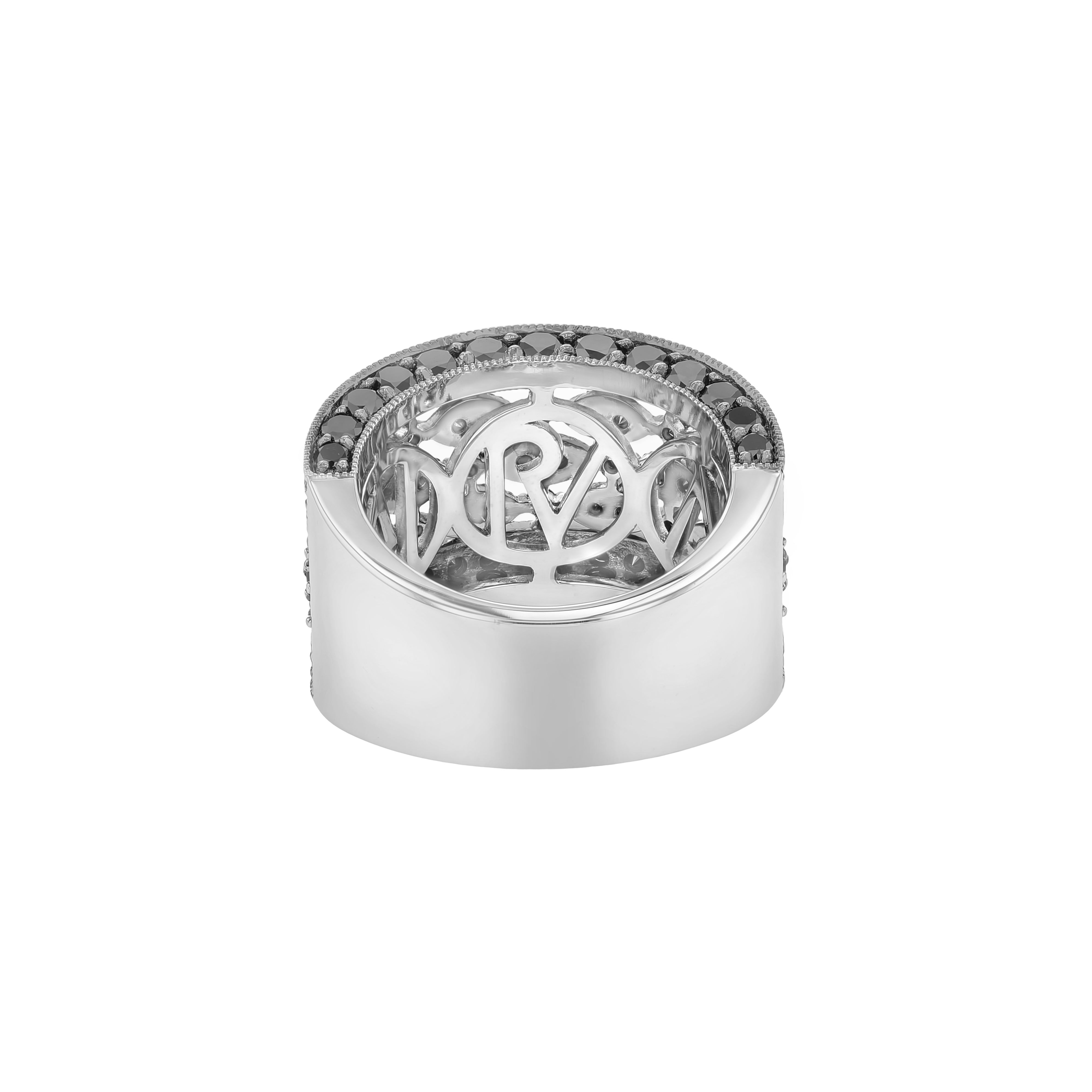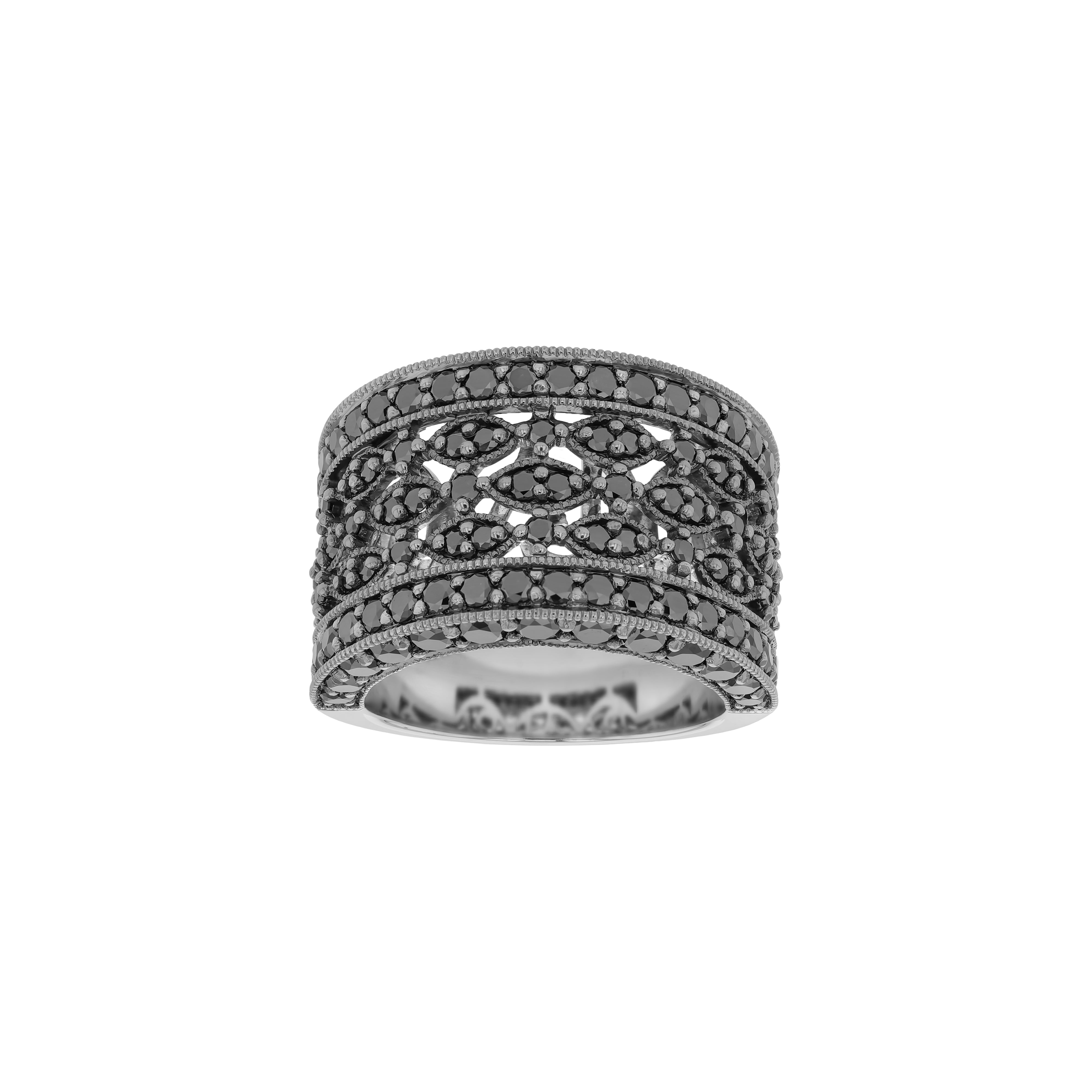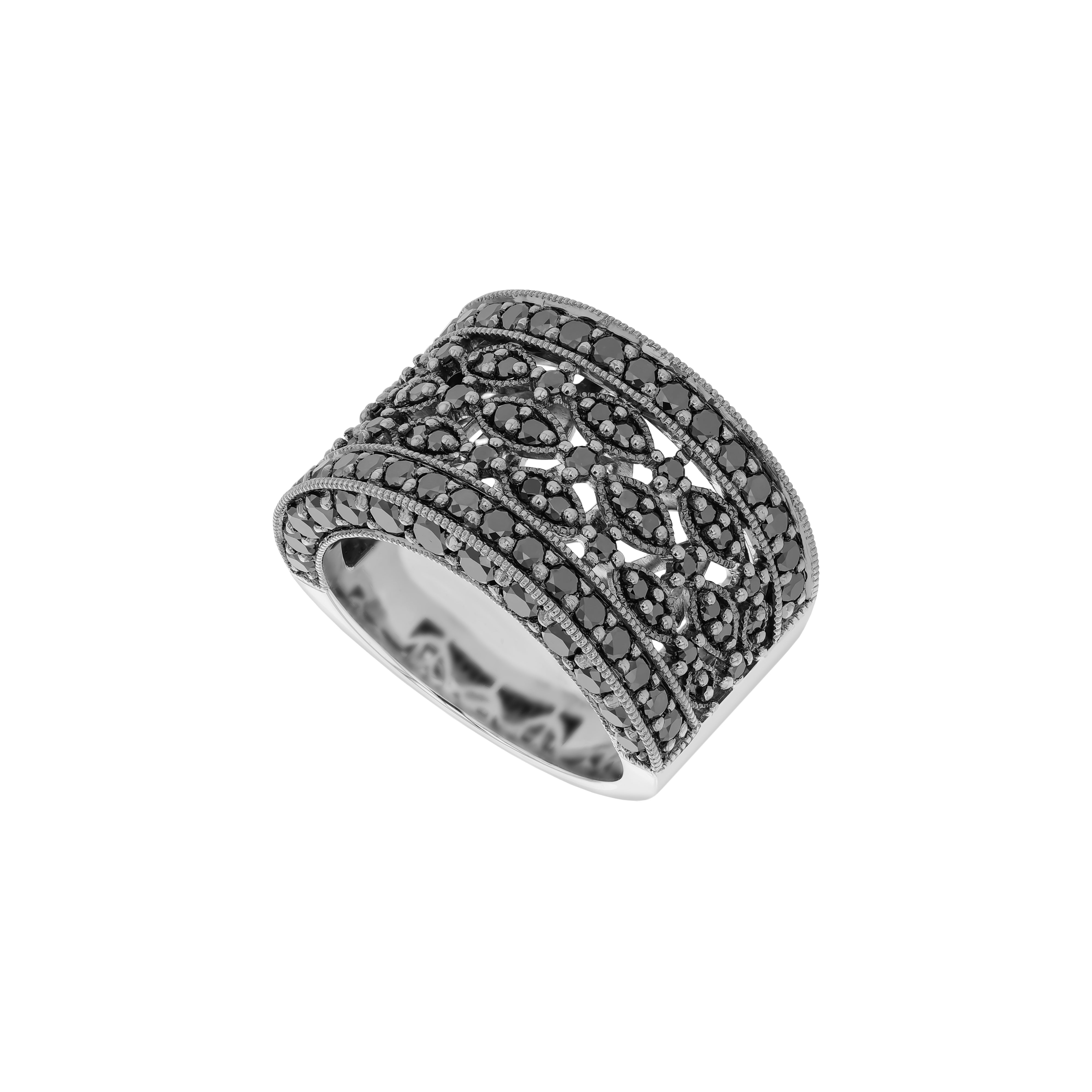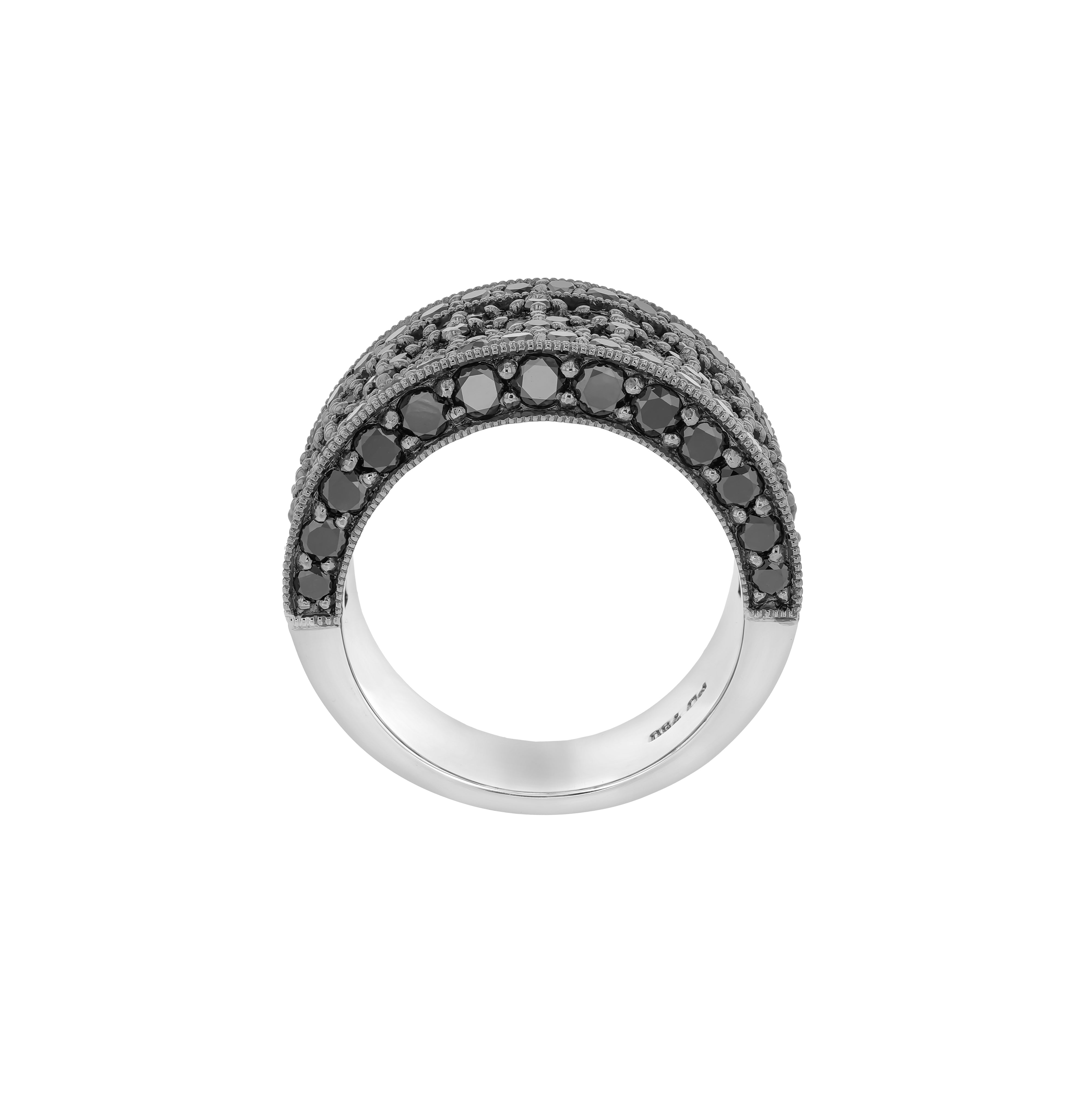 A spectacular dress ring with seven rows of black diamonds set tightly together in micro-pavé settings around an open tapering band providing a seamless array of brilliance across the finger. Handcrafted with an art deco millgrain.