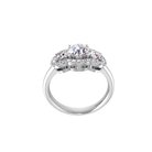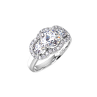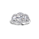 This meticulously handcrafted three-stone ring showcases a matching set of carefully selected brilliant cut diamonds, each cradled within exquisite fine prongs on a fine domed band.Uniquely sorrouded with a halo of micro claw set diamonds.