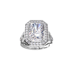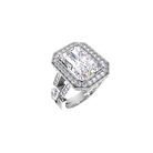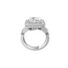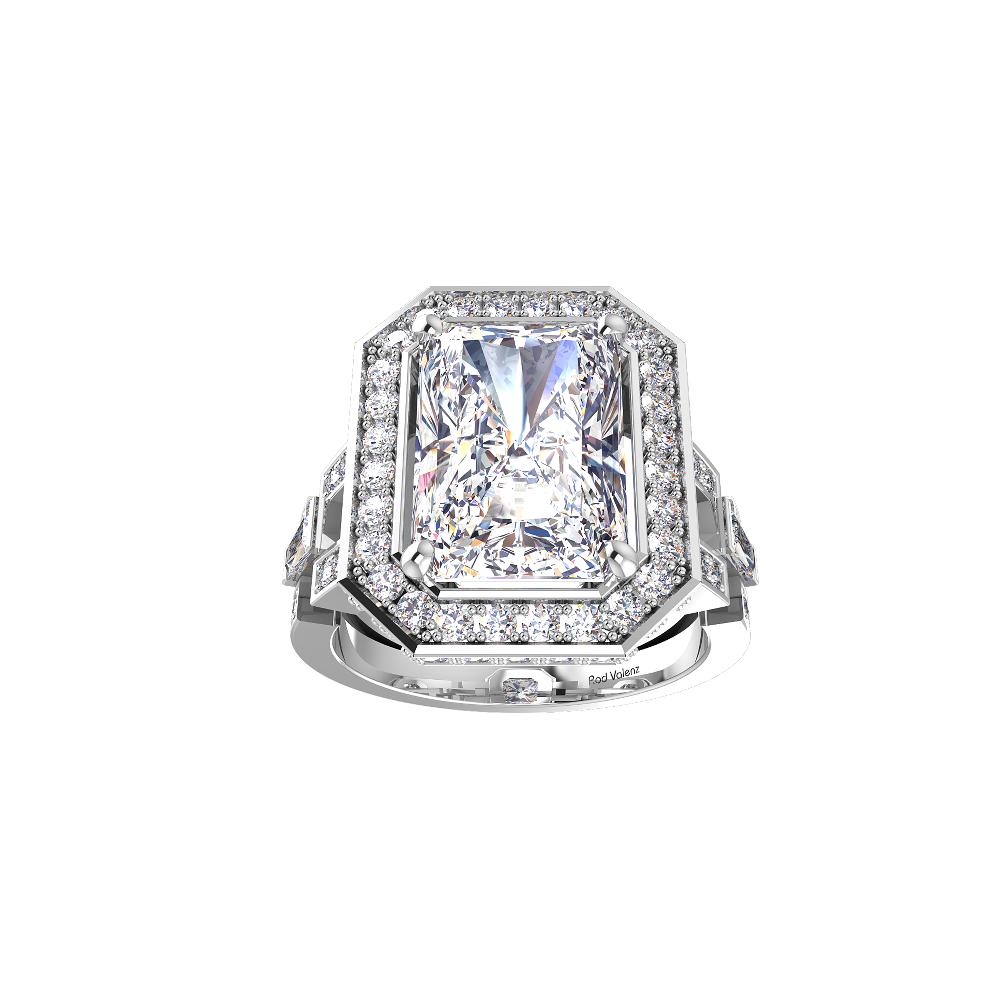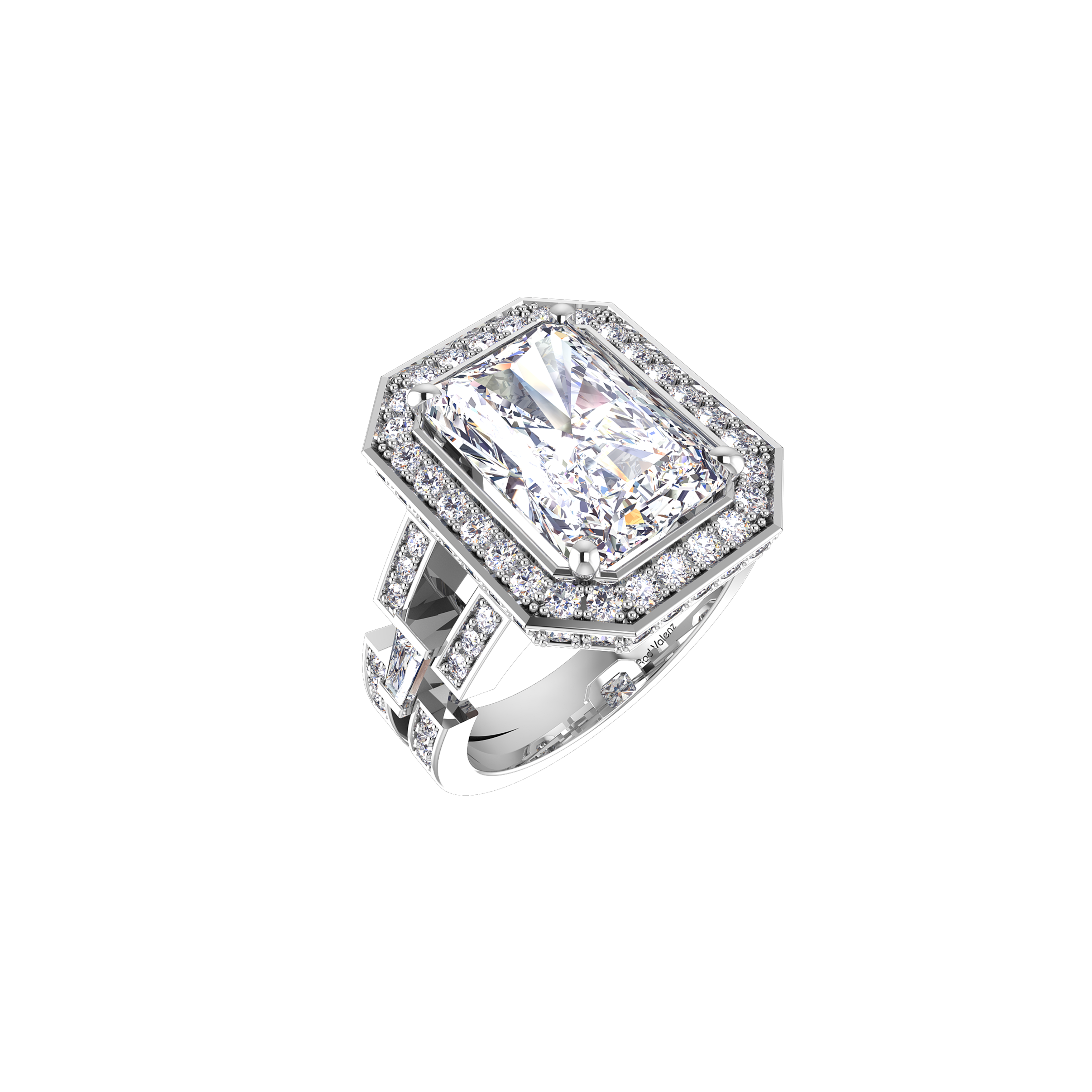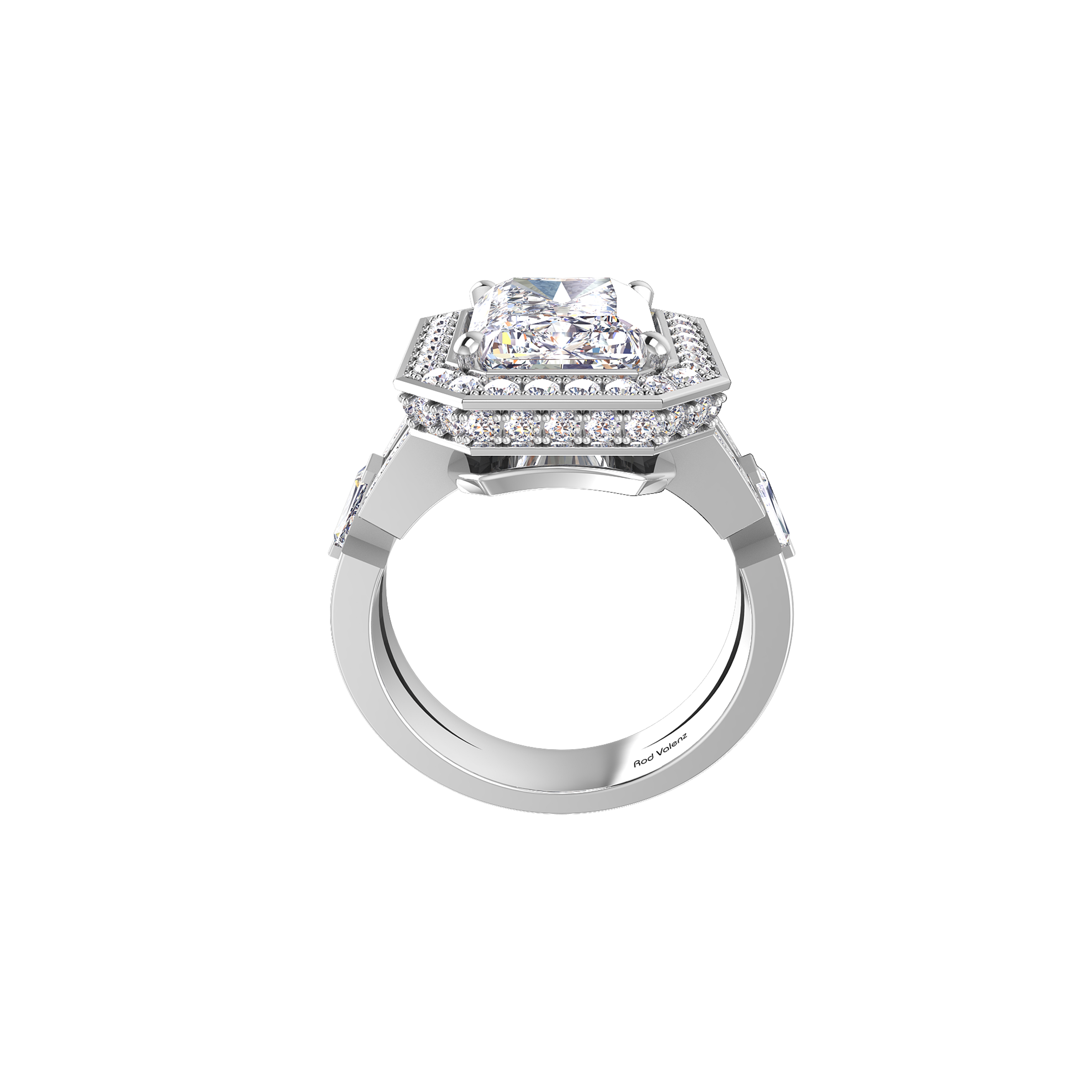 Inspired by antique design, this halo ring features a breathtaking octagonal shape radiant cut dialmond in the centre complemented by pavé set shoulders and halo with accent of 2 taper baguett diamonds.