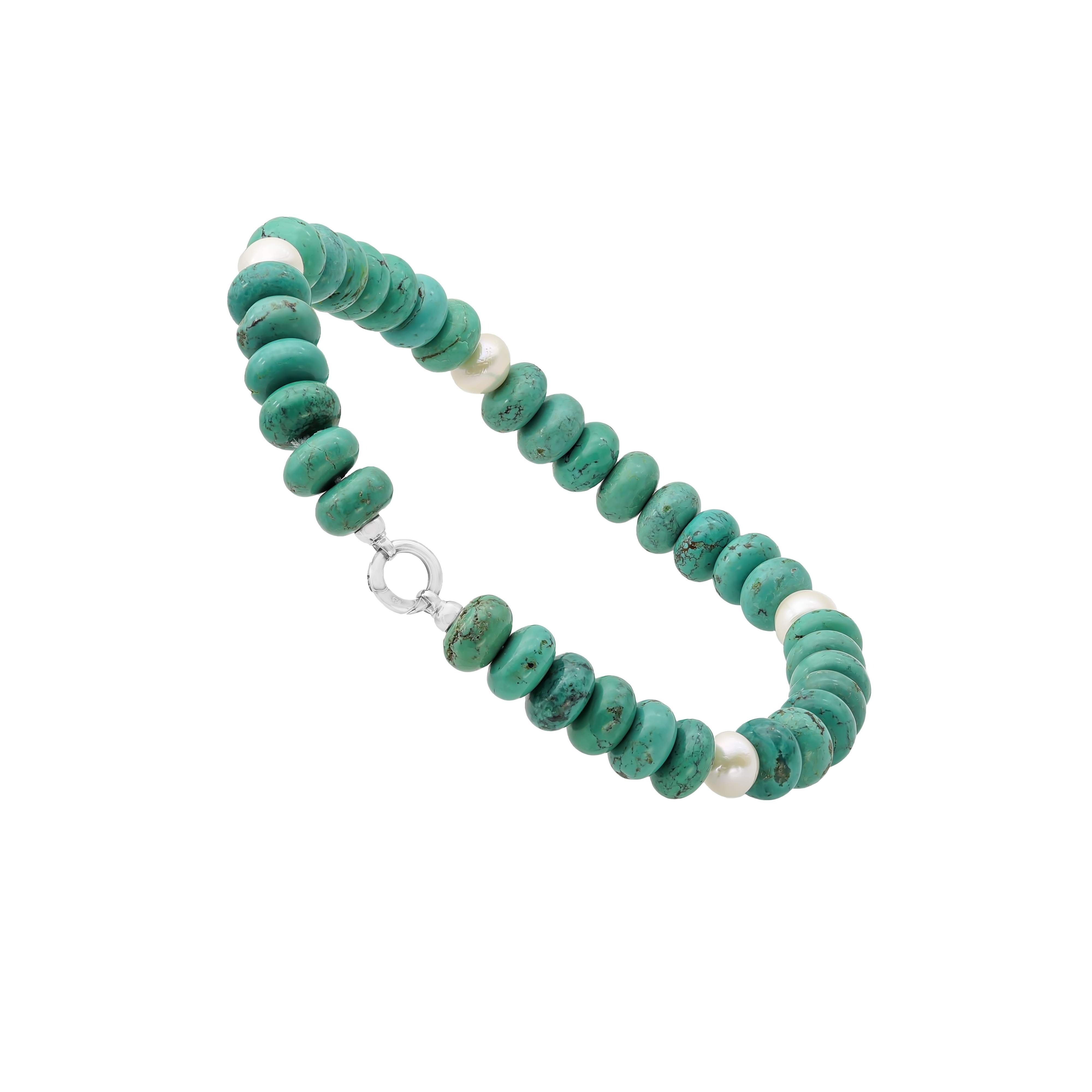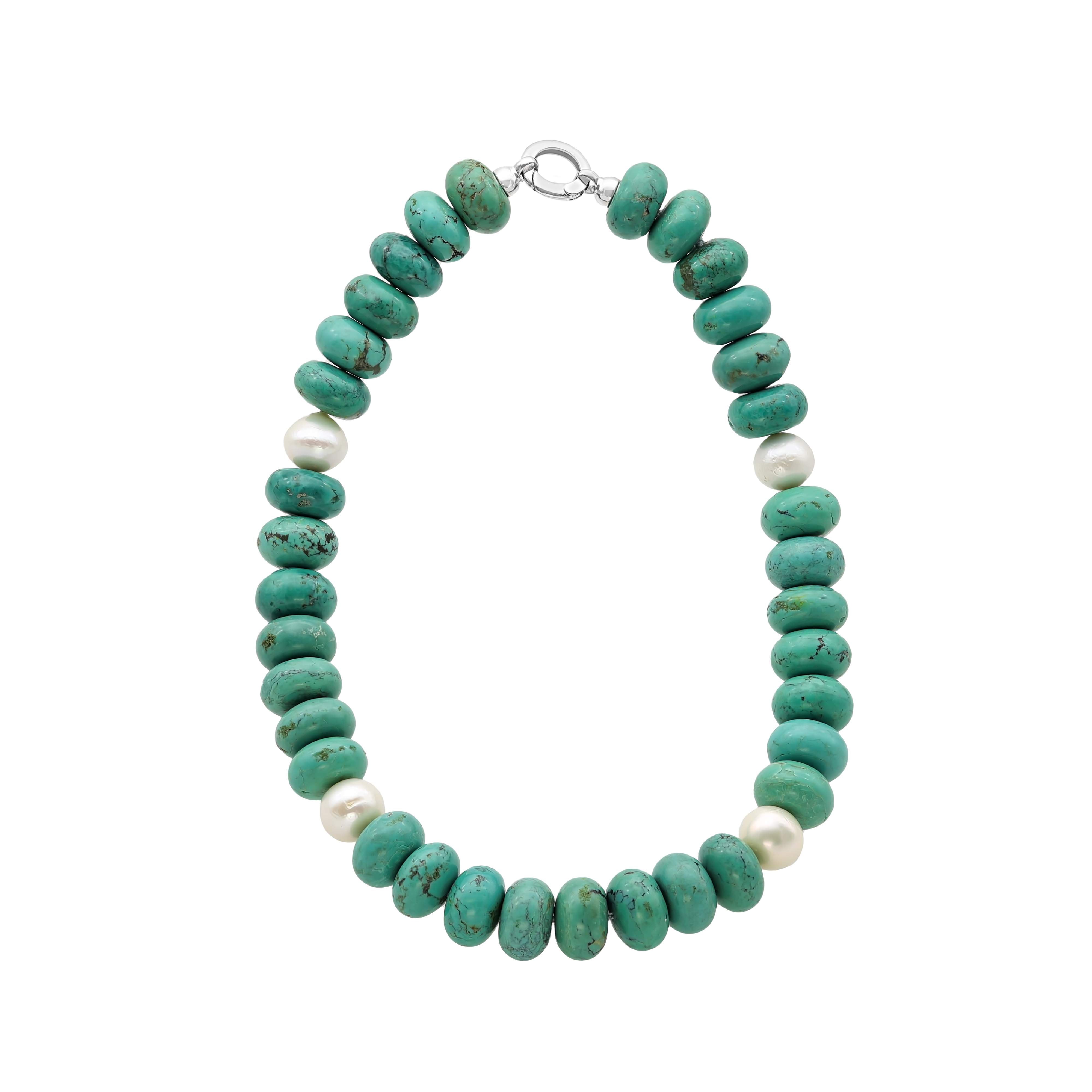 Using 34 x 19 x 12mm turquoise rondel gemstones, and 4 freshwater round pearls approximately 10-12mm in size.