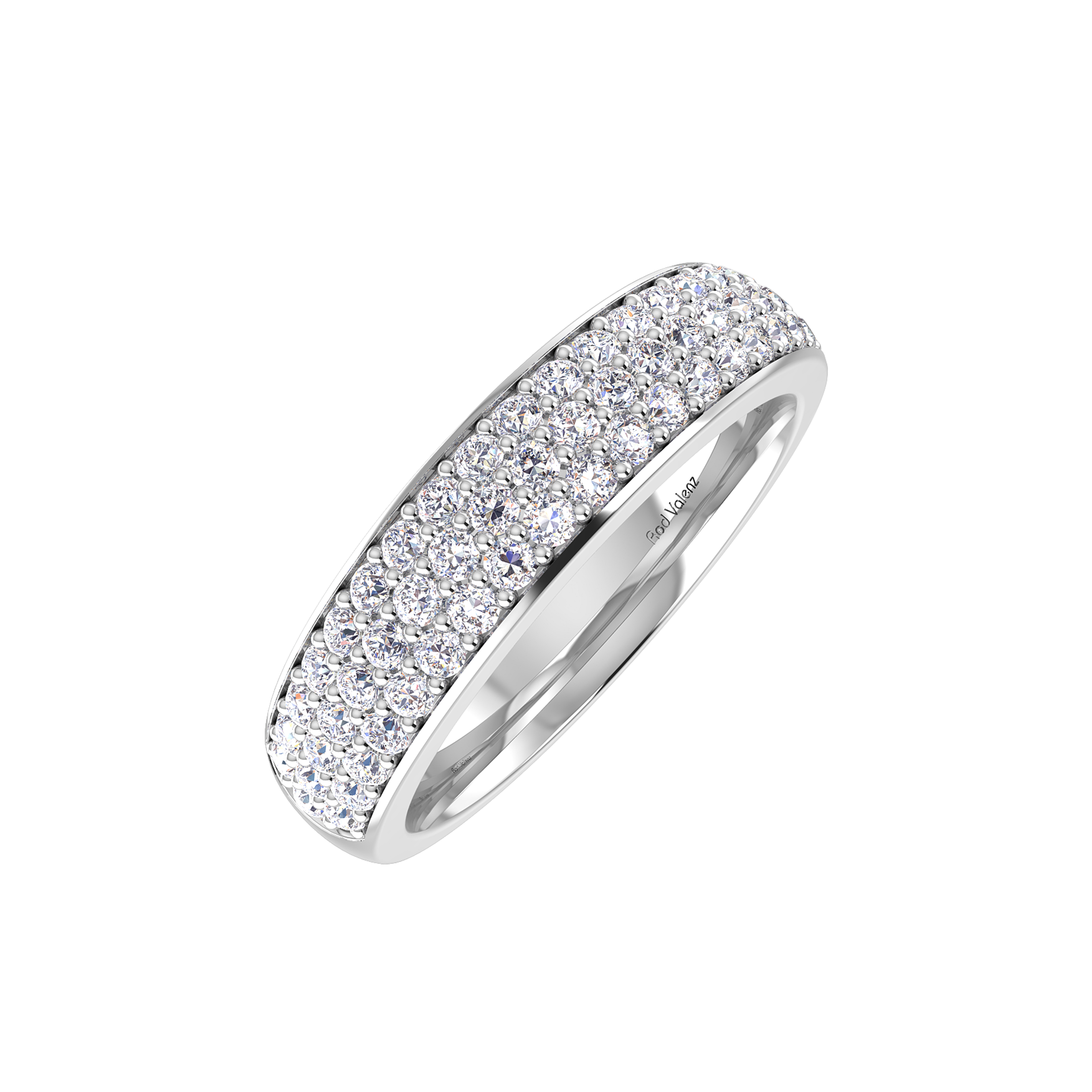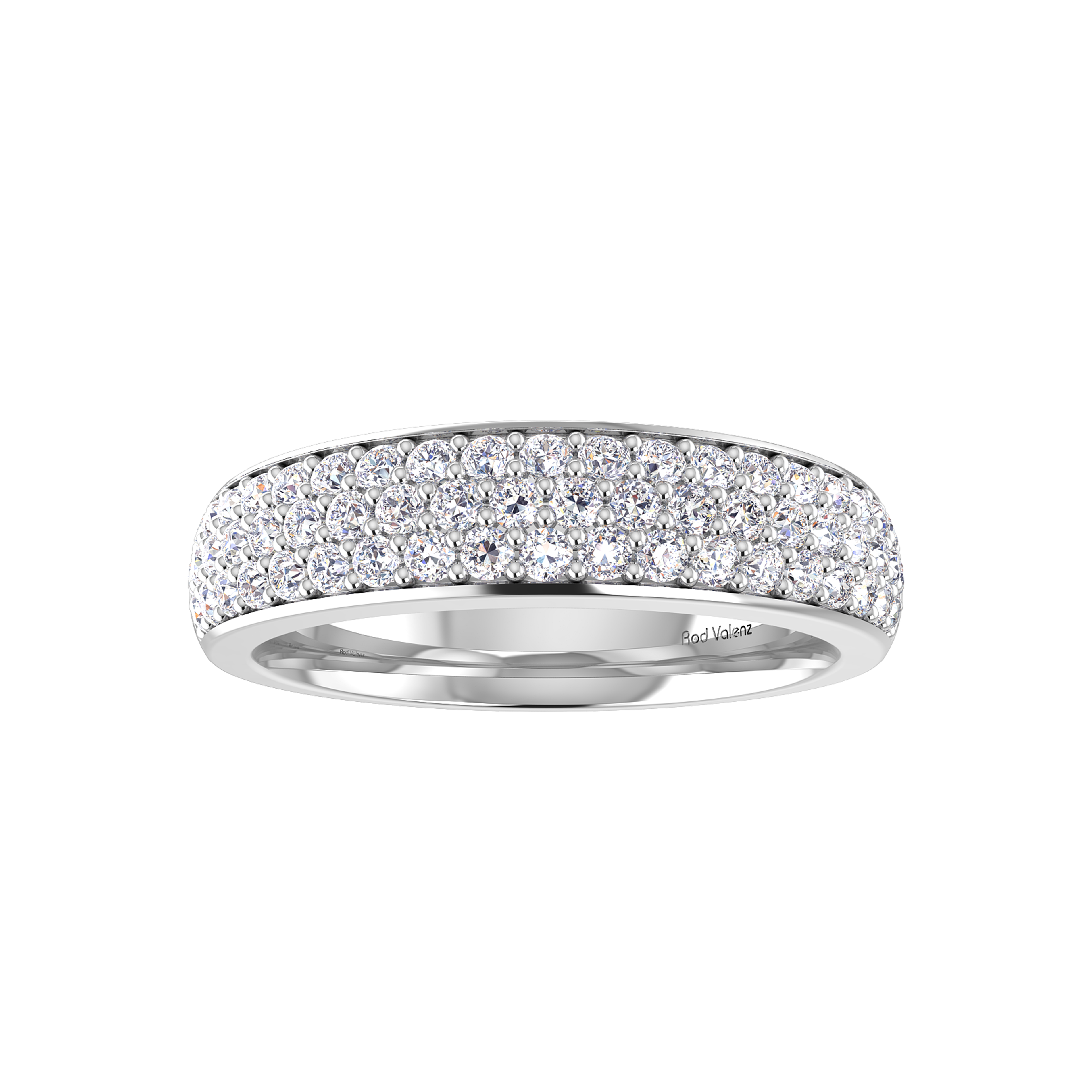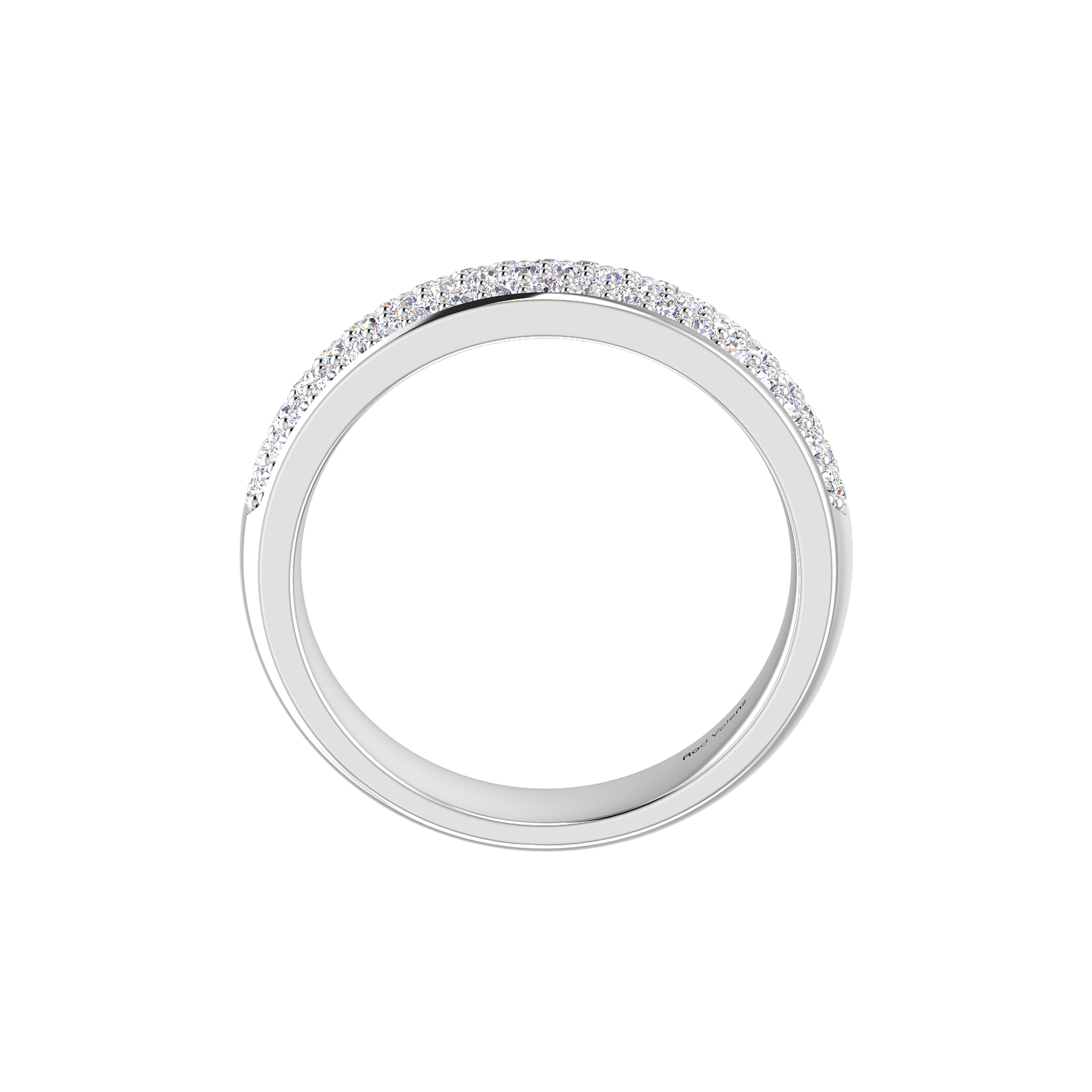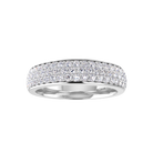A spectacular ring with three rows of matching diamonds set tightly together in micro-pavé settings around a domed solid made band providing a seamless array of brilliance across the finger. Handcrafted in either platinum or 18ct gold