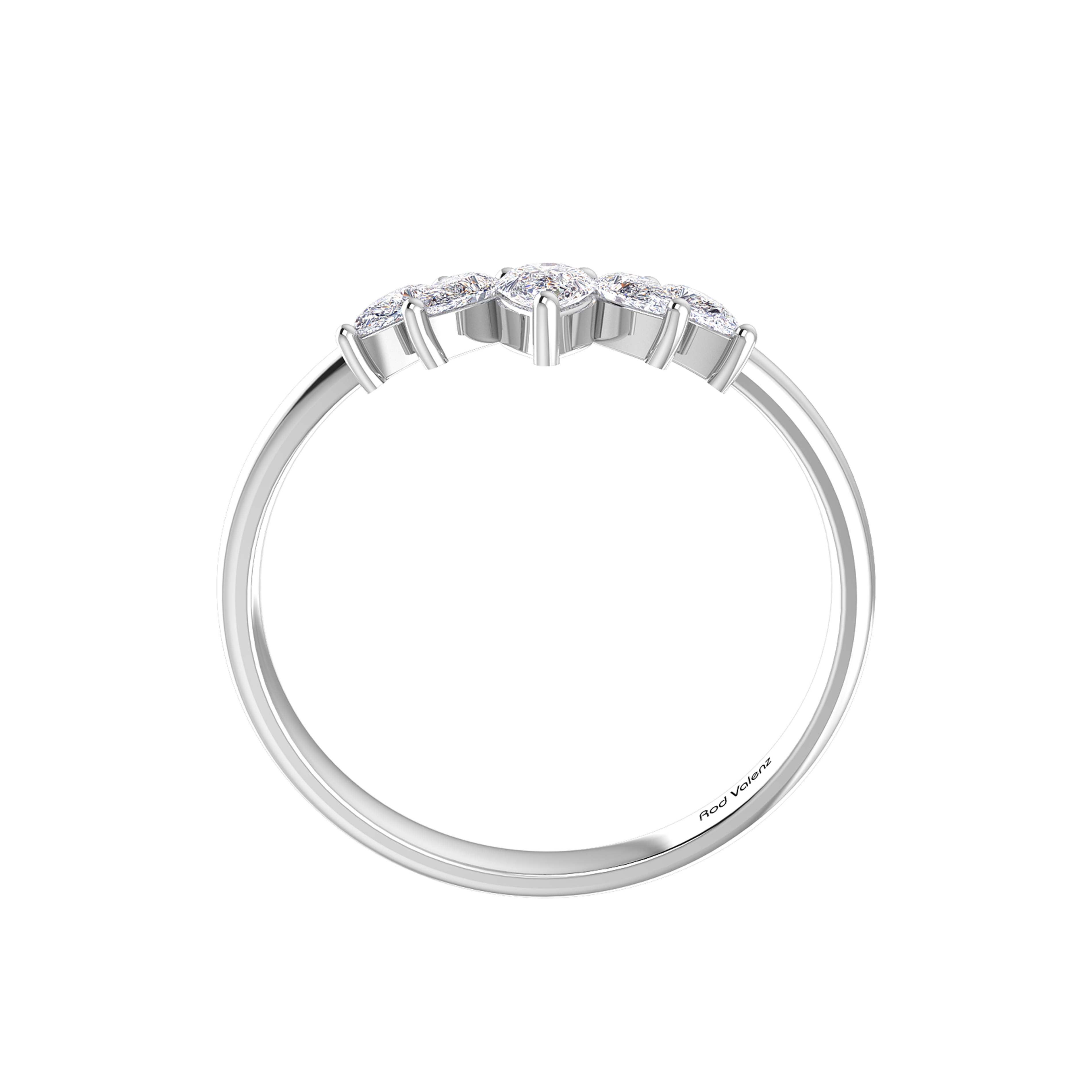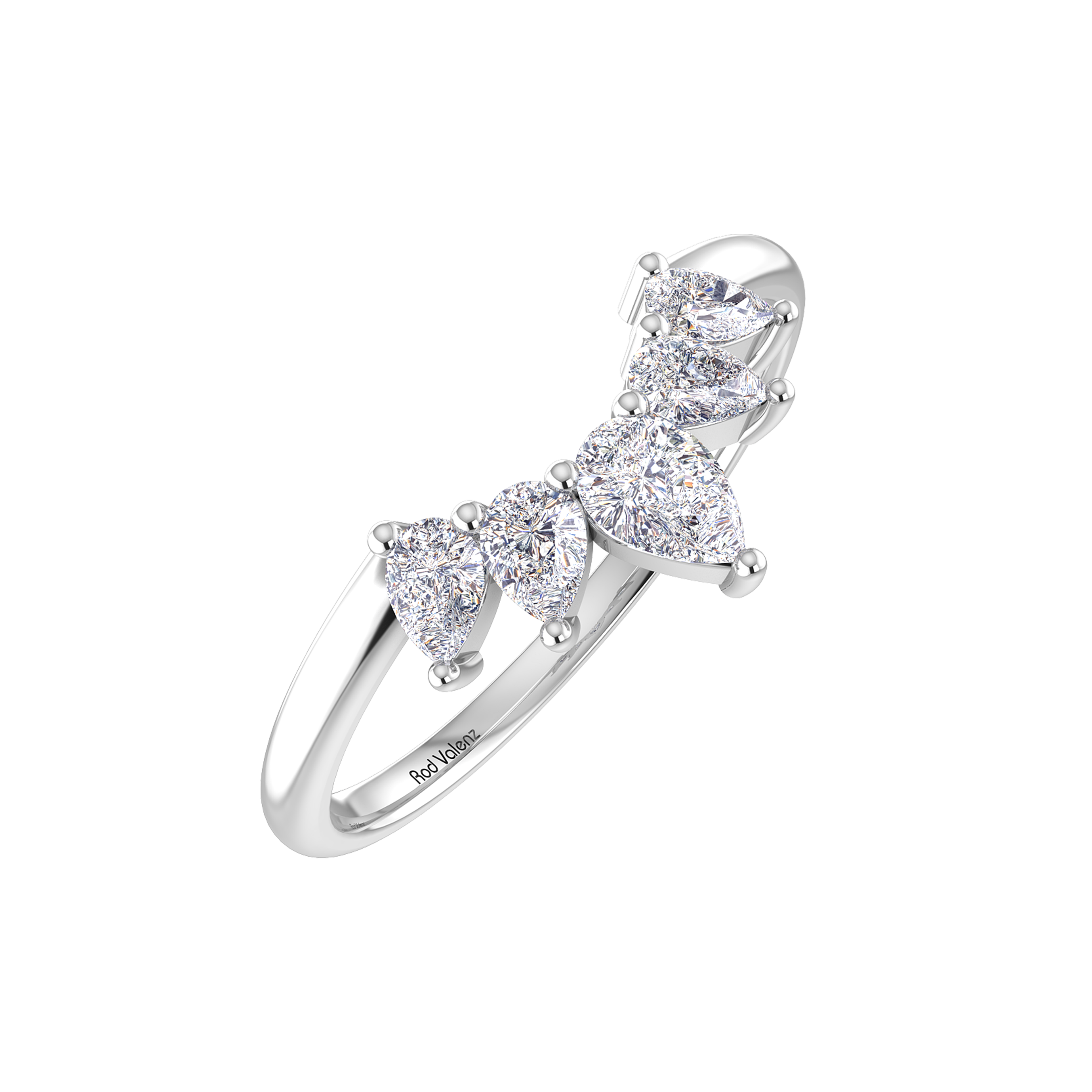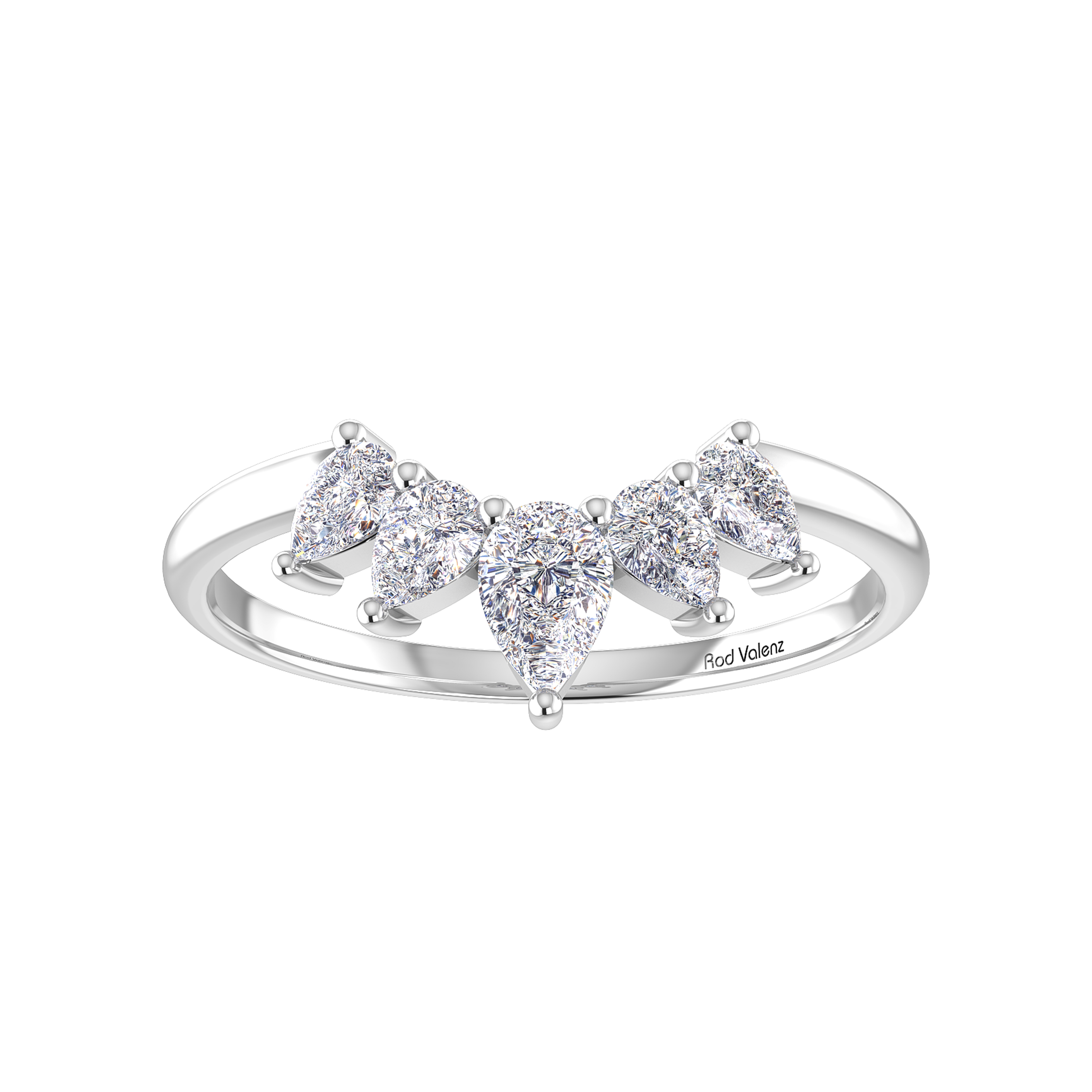 This exquisite ring features a unique 5 pear cut diamonds, flawlessly matched for cut, shape, and colour, set in fine shared-prong settings, on a soft domed comfort fit band meticulously handcrafted in platinum or 18ct gold palladium fine white gold.