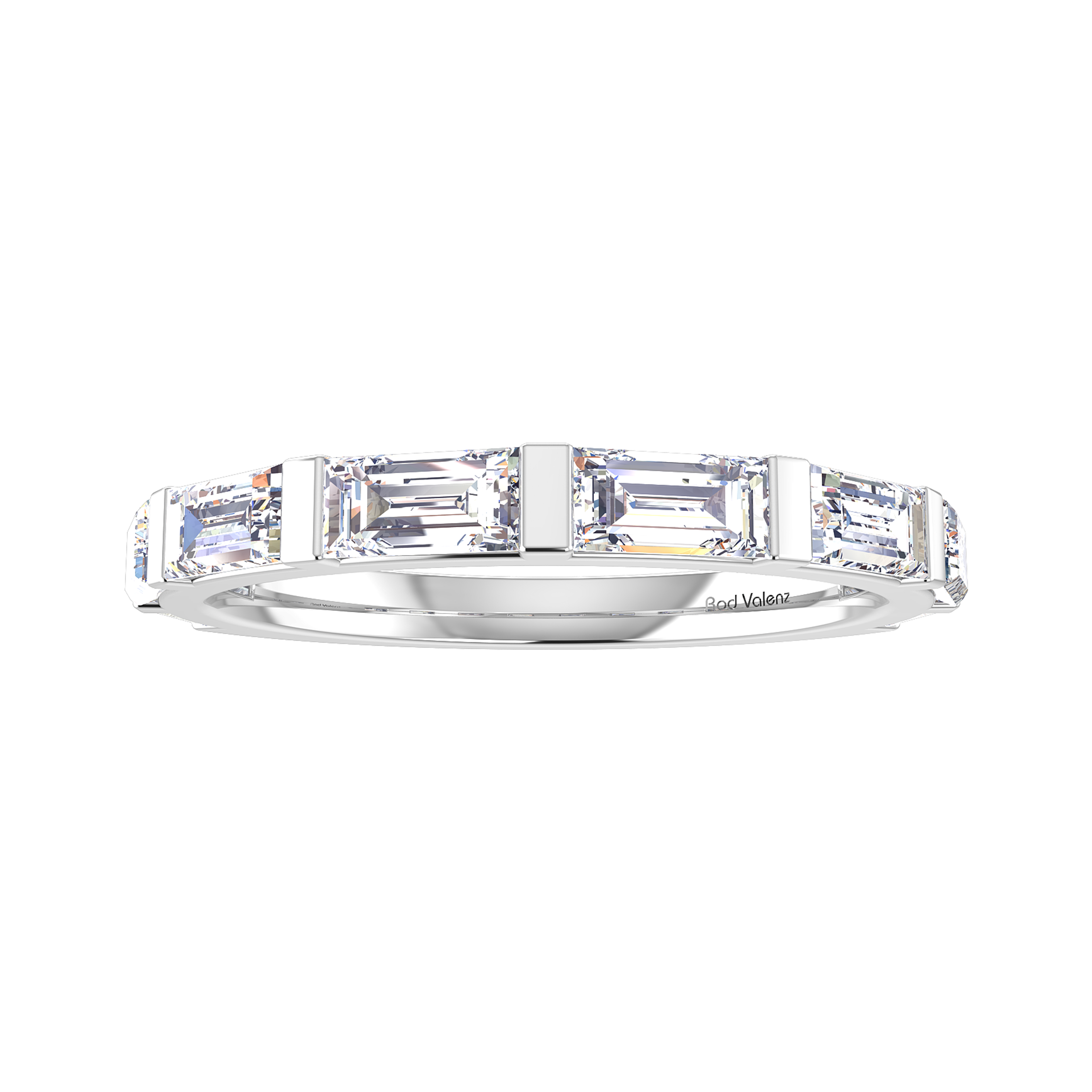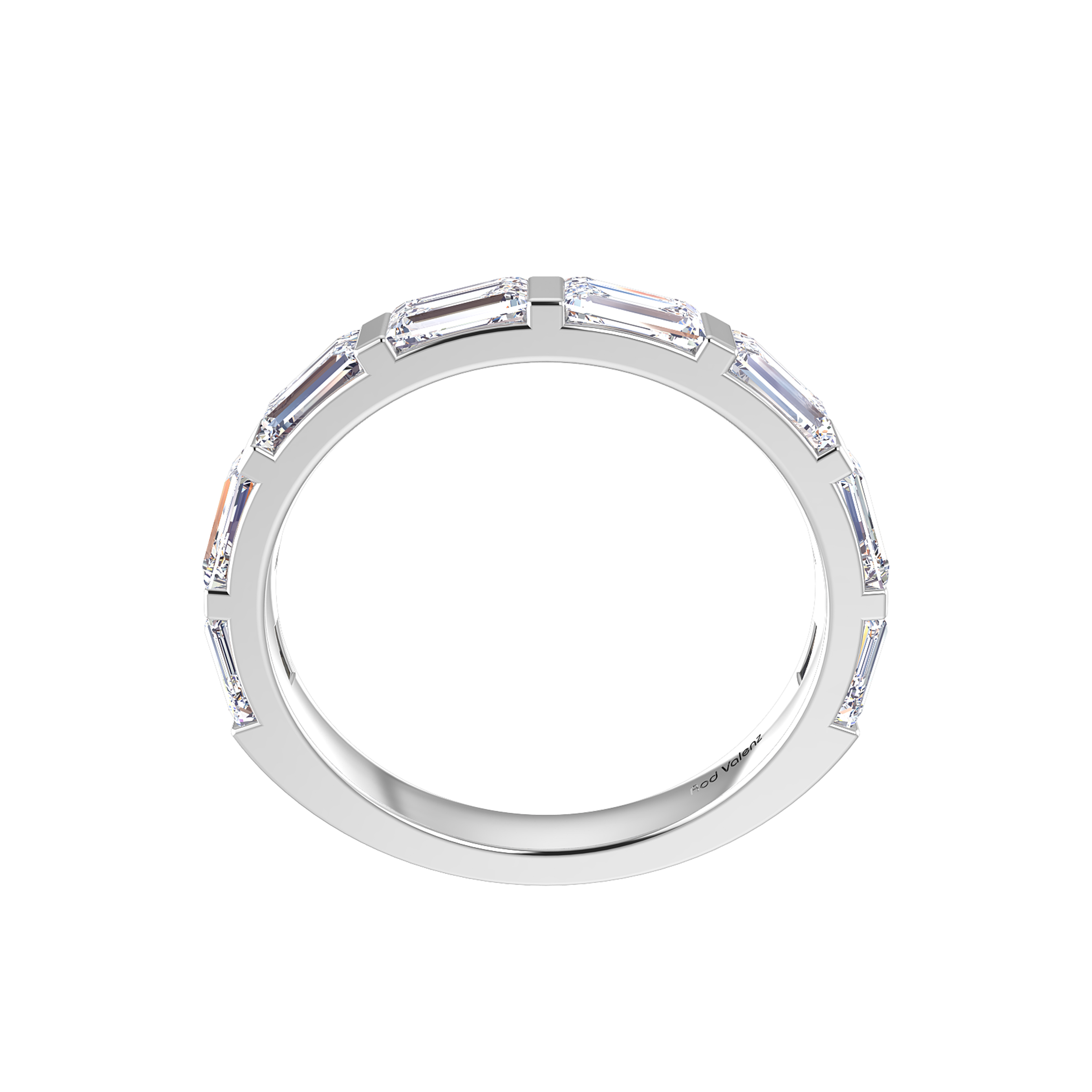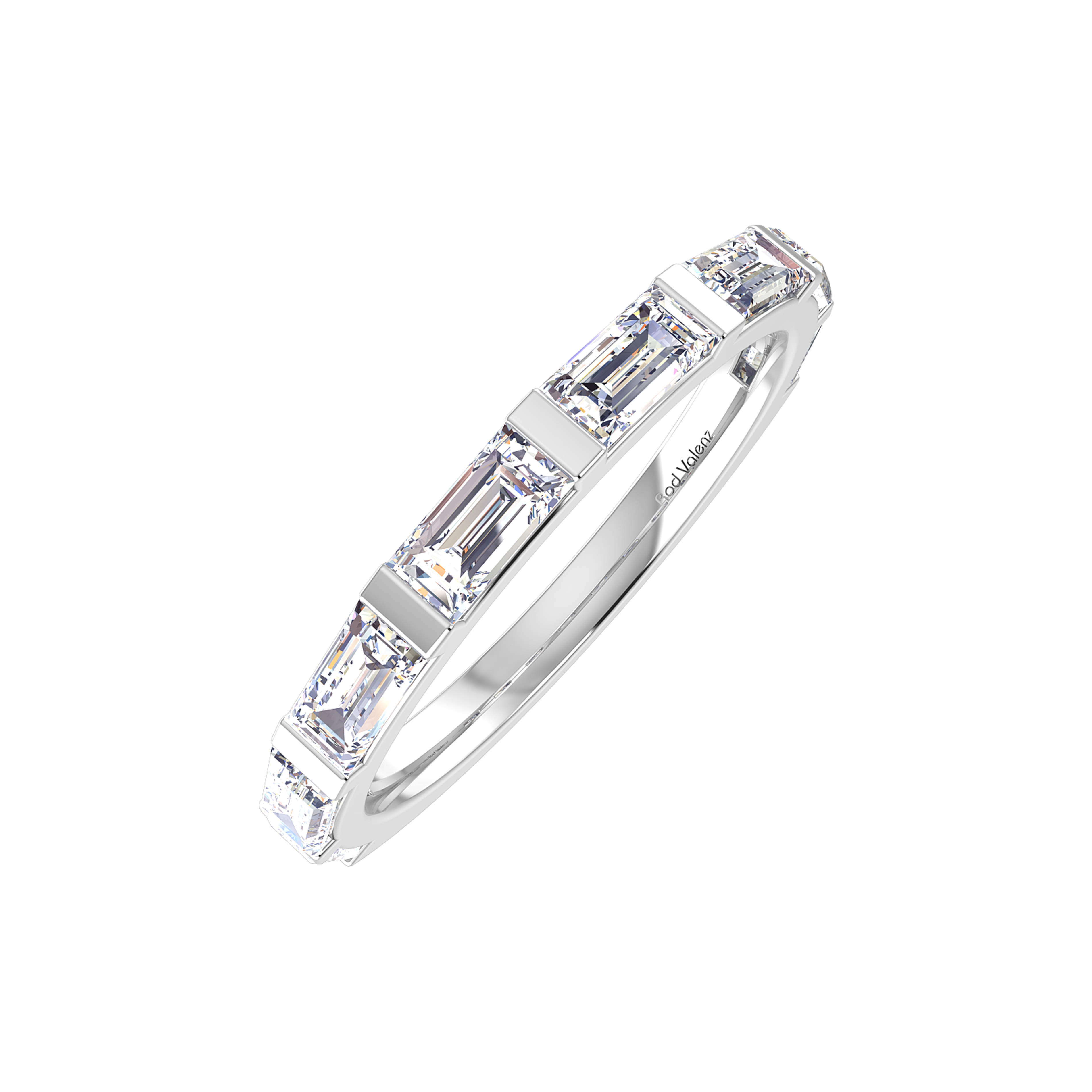 This exquisite ring features a unique 8 baguette cut diamond, flawlessly matched for cut, shape, and colour, set in fine channel settings, on a flat band. Meticulously handcrafted in platinum or 18ct gold.