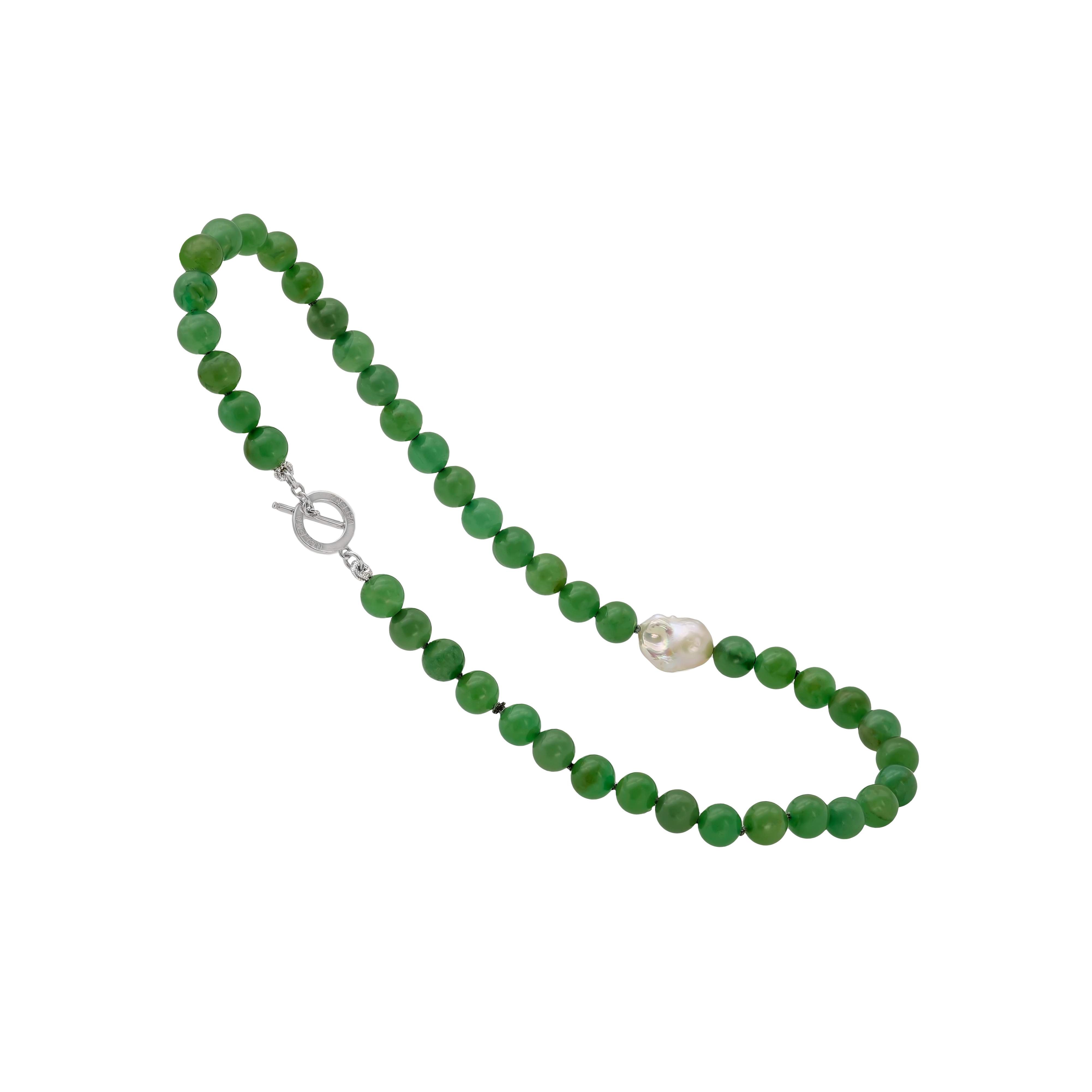 Using 42 x 10mm green Aventurine and 1 x 12mm natural fresh water baroque pearl with Argentium silver clasp. Double knotted for a luxurious feel.